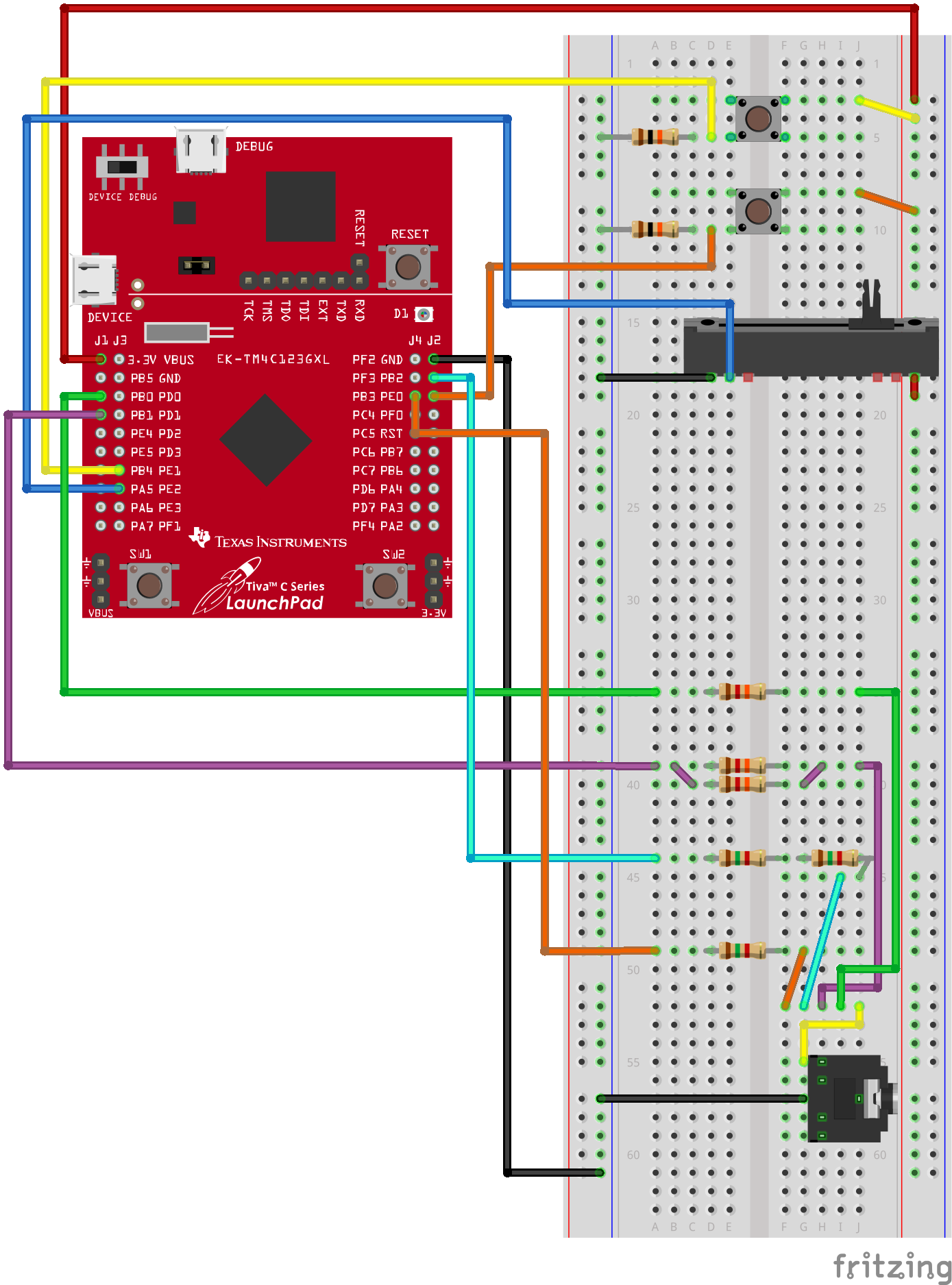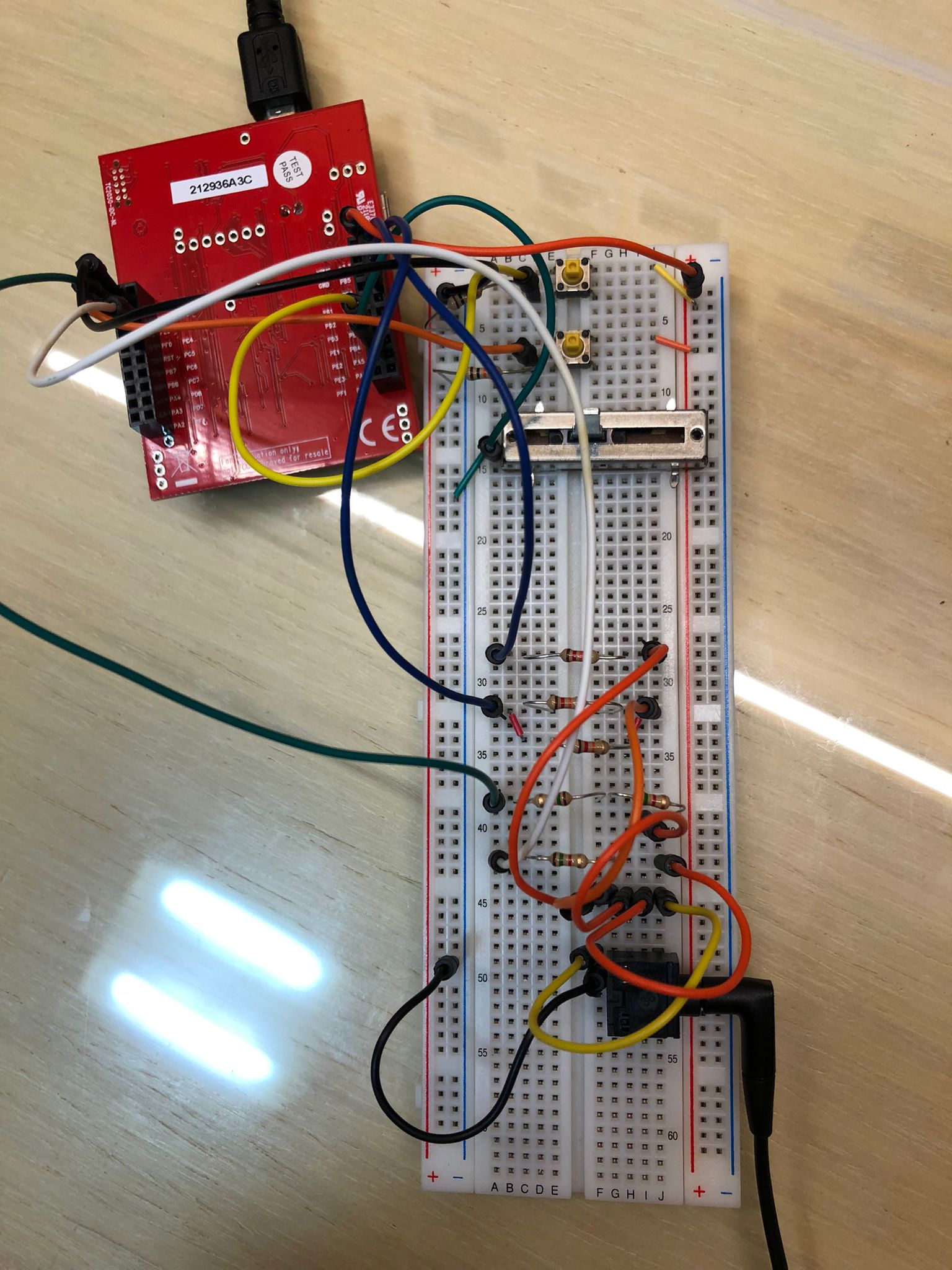 Note the 2 inputs and 1 output that are set up on the breadboard. The two switches on the top are for the switches input, while the slide potentiometer below it is the ADC input. Lastly, the resistors and audio jack at the bottom of the breadboard are for the audio output. The second output (virtual Nokia5110 screen) is connected to a laptop via a USB cable. Here’s a picture of the actual circuit: