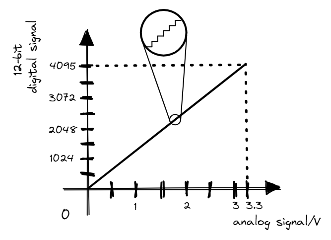 We use the concepts of discretisation and sampling in creating the ADC. On the EK-TM4C123GXL, the ADC takes in an analog signal of 0.0 to 3.3V and converts it to a digital number (0 to 4095). This means that the ADC uses 12 bits (\(2^{12} = 4096\)) - its precision is 4096 while the resolution is \(3.3V/4095 \approx 0.81mV\).