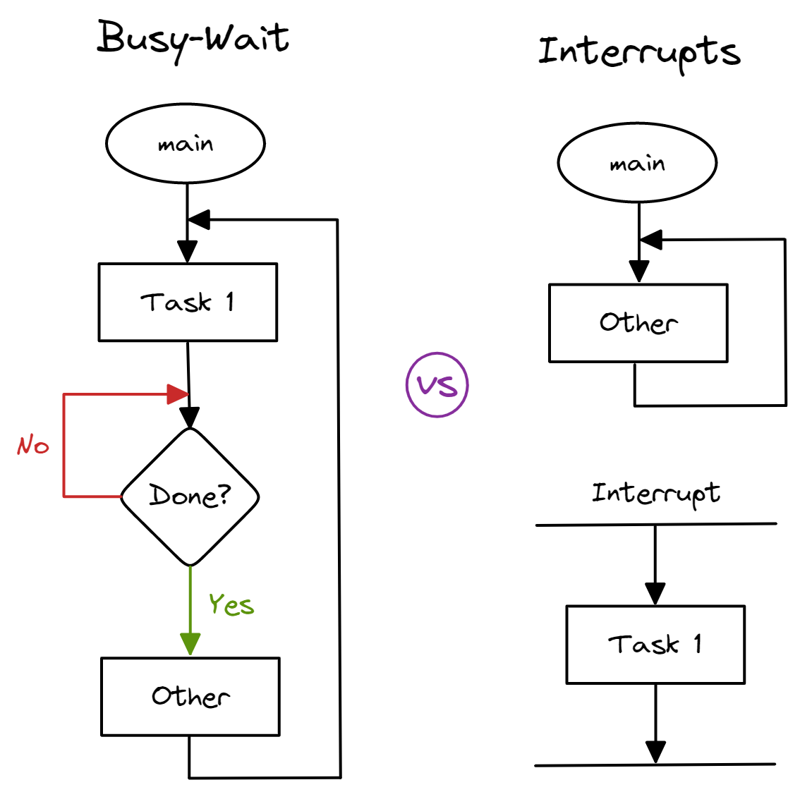 We can illustrate this difference using an analogy. Imagine that you are expecting a call from your boss. Using busy-wait is like staring at your phone waiting for it to ring, while using an interrupt is working on your other tasks and only focusing on your phone when it rings. Using busy-wait is far less efficient as you could have been working on other tasks while waiting for your phone to ring. Therefore, using interrupts enables embedded systems to make efficient use of processor time, allowing them to be truly responsive and real-time. Next, we will explore what interrupts are and how we use them.