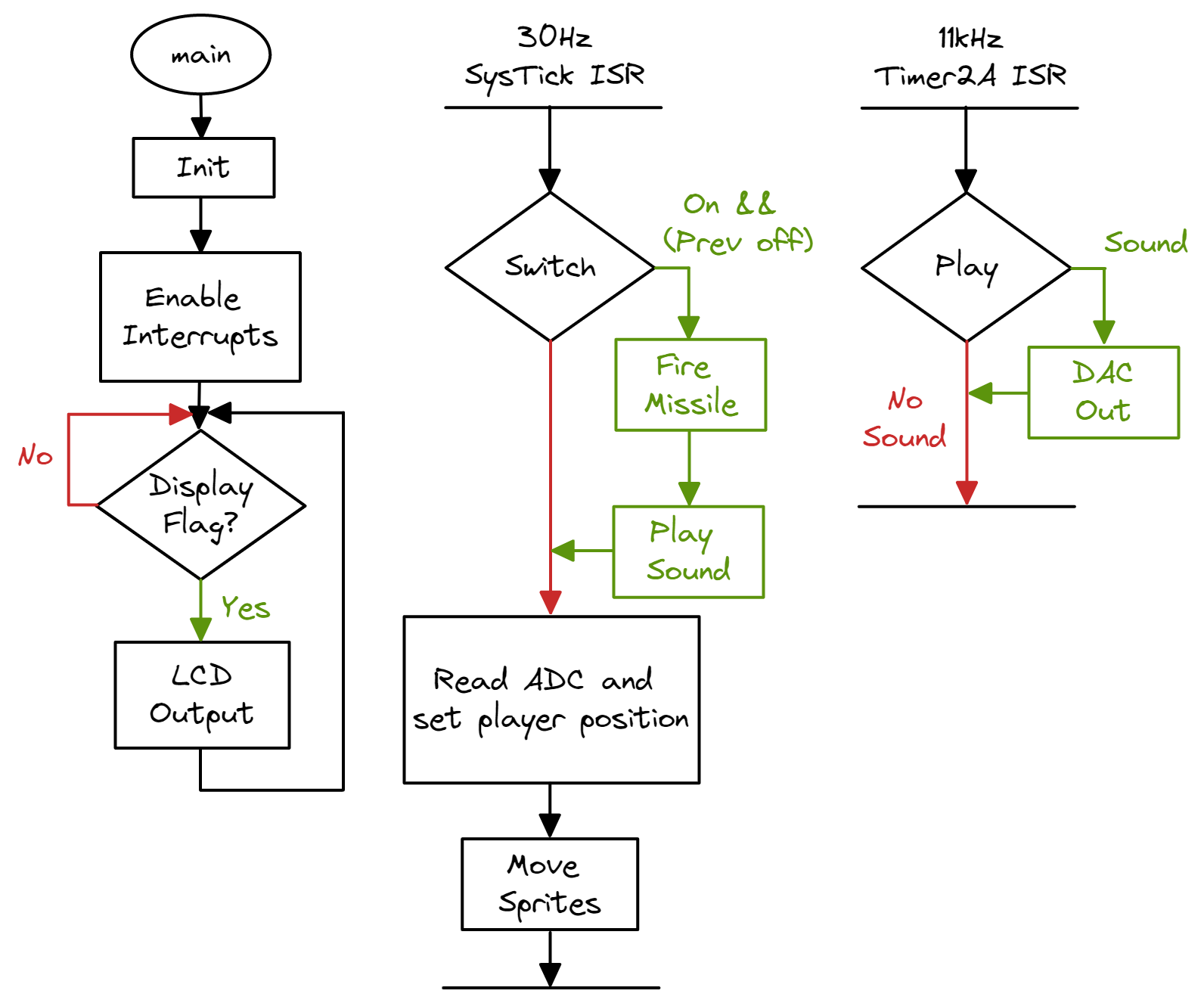 The SysTick timer is configured to trigger at 30 Hz (once every 0.033s), where the ISR reads from the ADC (player position) and switch inputs (fire missile), then updates the game state. The Timer2 timer is configured to trigger at 11 kHz (once every 0.000091s), where the ISR uses the DAC to produce game sounds.
