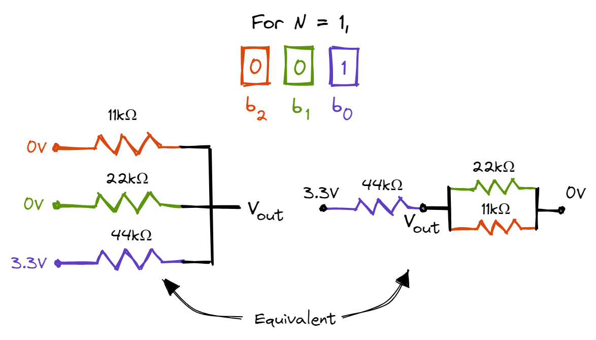 The circuit on the right is equivalent to the circuit on the left. As the 11k\(\Omega\) and 22k\(\Omega\) resistors are in parallel, the effective resistance is 22k/3\(\Omega\). As such, \(V_{out}\) = \(\frac{22/3}{44 + 22/3} * 3.3V = \frac{1}{7}*3.3V\). Next, let’s examine what happens when the DAC outputs the number 2: