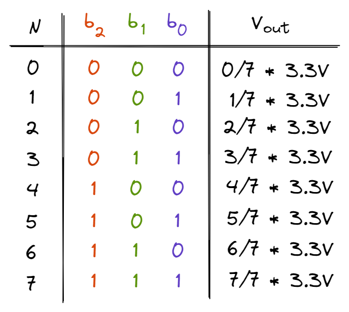 As the 11k\(\Omega\) and 44k\(\Omega\) resistors are in parallel, the effective resistance is 44k/5\(\Omega\). As such, \(V_{out}\) = \(\frac{44/5}{22 + 44/5} * 3.3V = \frac{2}{7}*3.3V\). Using the same analysis, we discover that when the DAC outputs the number 4, \(V_{out} = \frac{4}{7}*3.3V\). Utilising the Superposition Theorem, we can determine all the different outputs of the DAC: