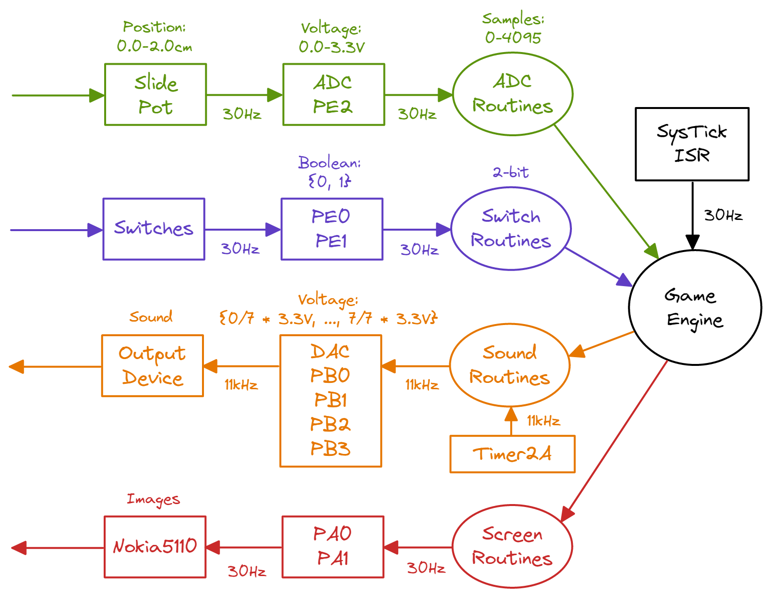 - Game Engine: game state updated by SysTick ISR