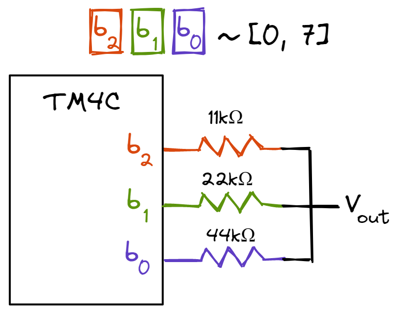 Let’s design a 3-bit binary weighted DAC that converts digital numbers between 0 and 7 to analog signals between 0.0V and 3.3V. As it has 3 bits, the precision is \(2^3=8\) while the resolution is \(3.3V/7\). Let \(b_0\) be the least significant bit and \(b_2\) be the most significant bit. To build the DAC, we connect an 11k\(\Omega\) resistor to \(b_2\)’s GPIO pin, a 22k\(\Omega\) resistor to \(b_1\)’s GPIO pin and a 44k\(\Omega\) resistor to \(b_0\)’s GPIO pin. Let’s see what happens when the DAC outputs the number 1: