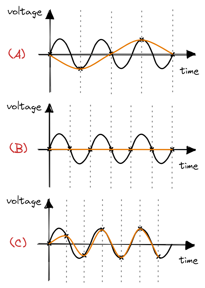 As seen above, when sampling at <=2f, the reconstructed wave will have a lower frequency compared to the analog signal. Thus, in theory, we need to sample at a rate more than double of the maximum frequency of the analog signal. In practice, we should sample at a rate significantly higher than the maximum frequency (Professor Valvano postulates that we should sample at >10f).
