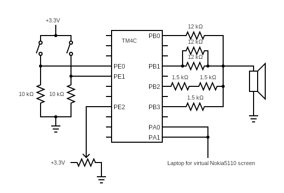 - DAC bit 0: 12 k\(\Omega\) resistor on PB0 (Least significant bit)