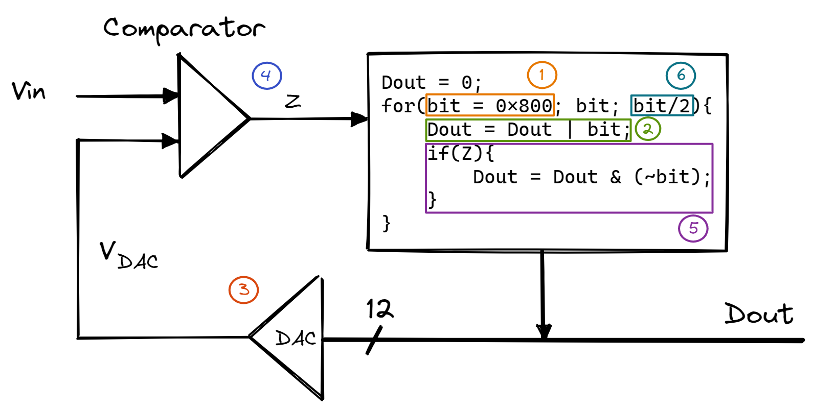 forloop: If \(Z=1\), this means that \(V_{in} < V_{DAC}\) and so the 12th bit ofD_{out}should be cleared. - For the next iteration of the