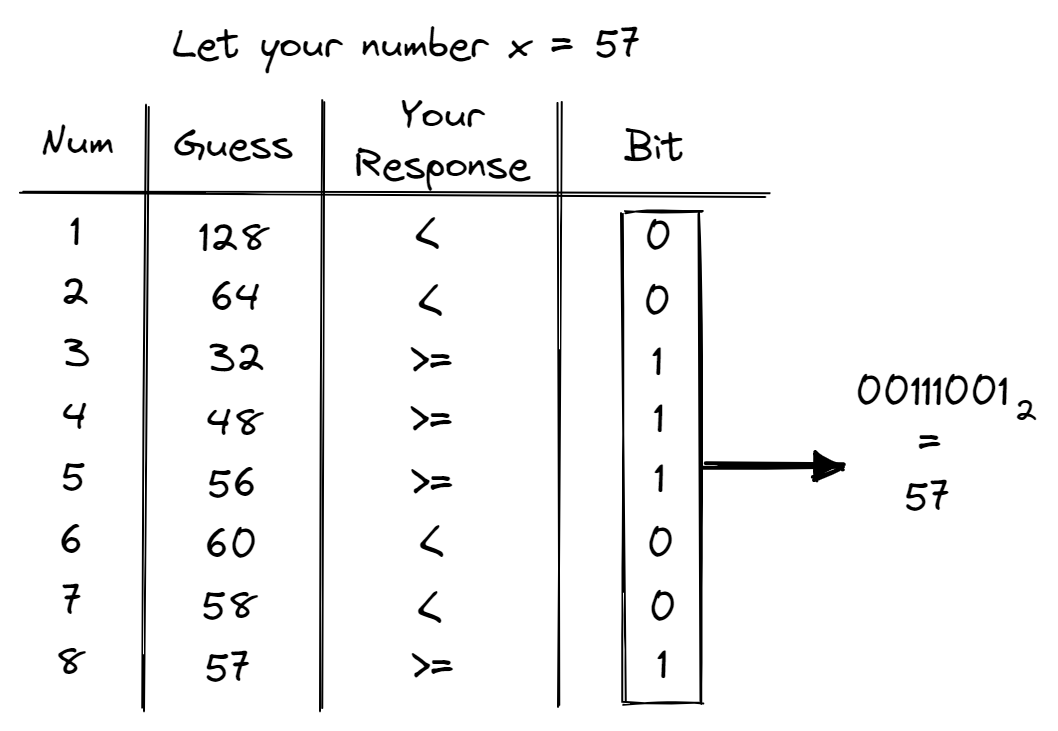 The most straightforward but inefficient method would be to guess each number between 0 and 255 (time complexity of \(O(N)\)). A far more efficient method would be to do a binary search (time complexity of \(O(log(N))\)). For example, assume that you are thinking of 57. I will first guess 128, in which you’ll tell me that your number is lower. Knowing that your number is between 0 and 127, I will guess 64. Again, you’ll tell me that your number is lower and I’ll know that your number is between 0 and 63. Next, I’ll guess 32 and you’ll tell me that your number is greater than or equal to 32. Deducing that your number is between 32 and 63, I will guess 48. This continues until I have successfully guessed your number of 57.
