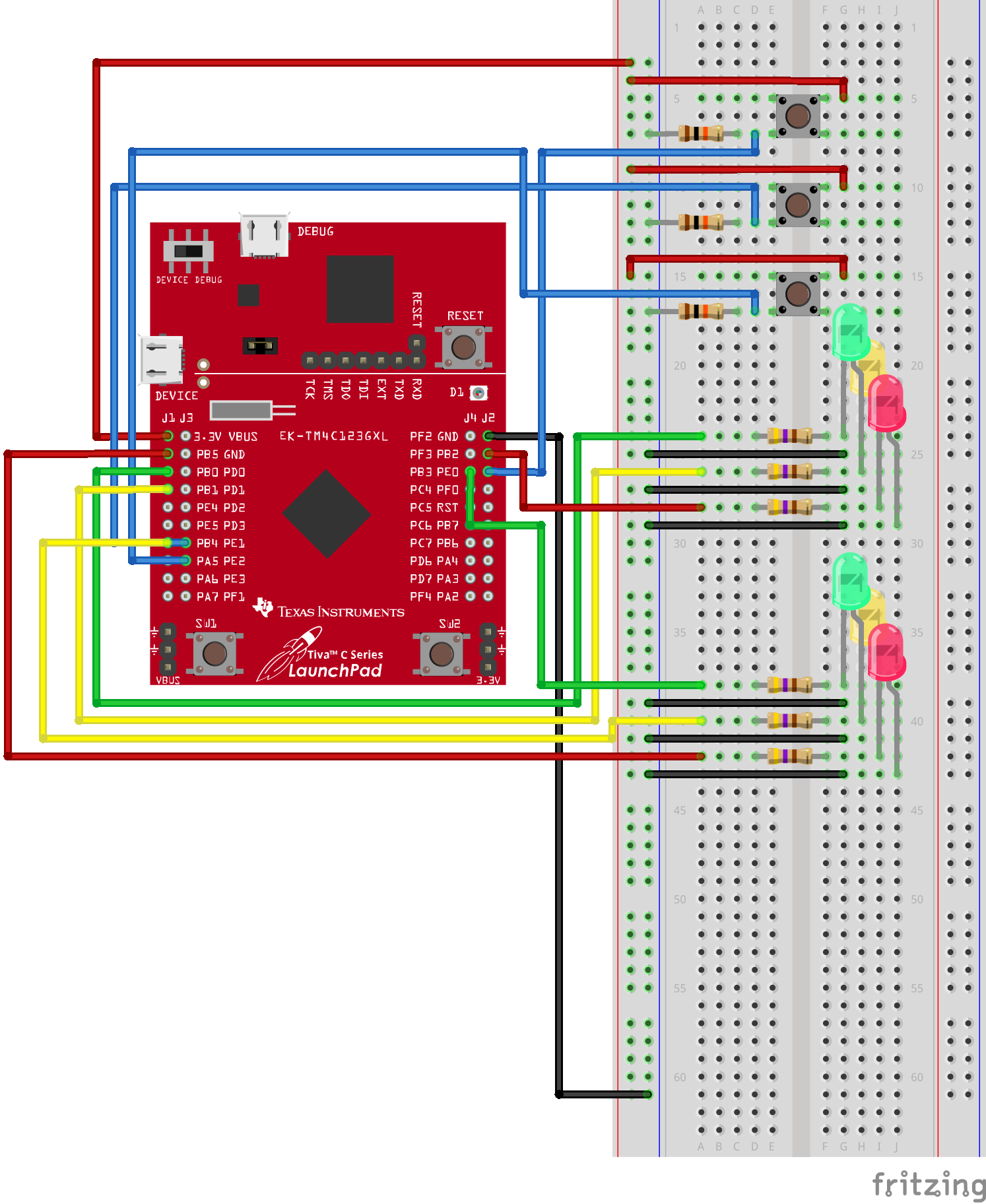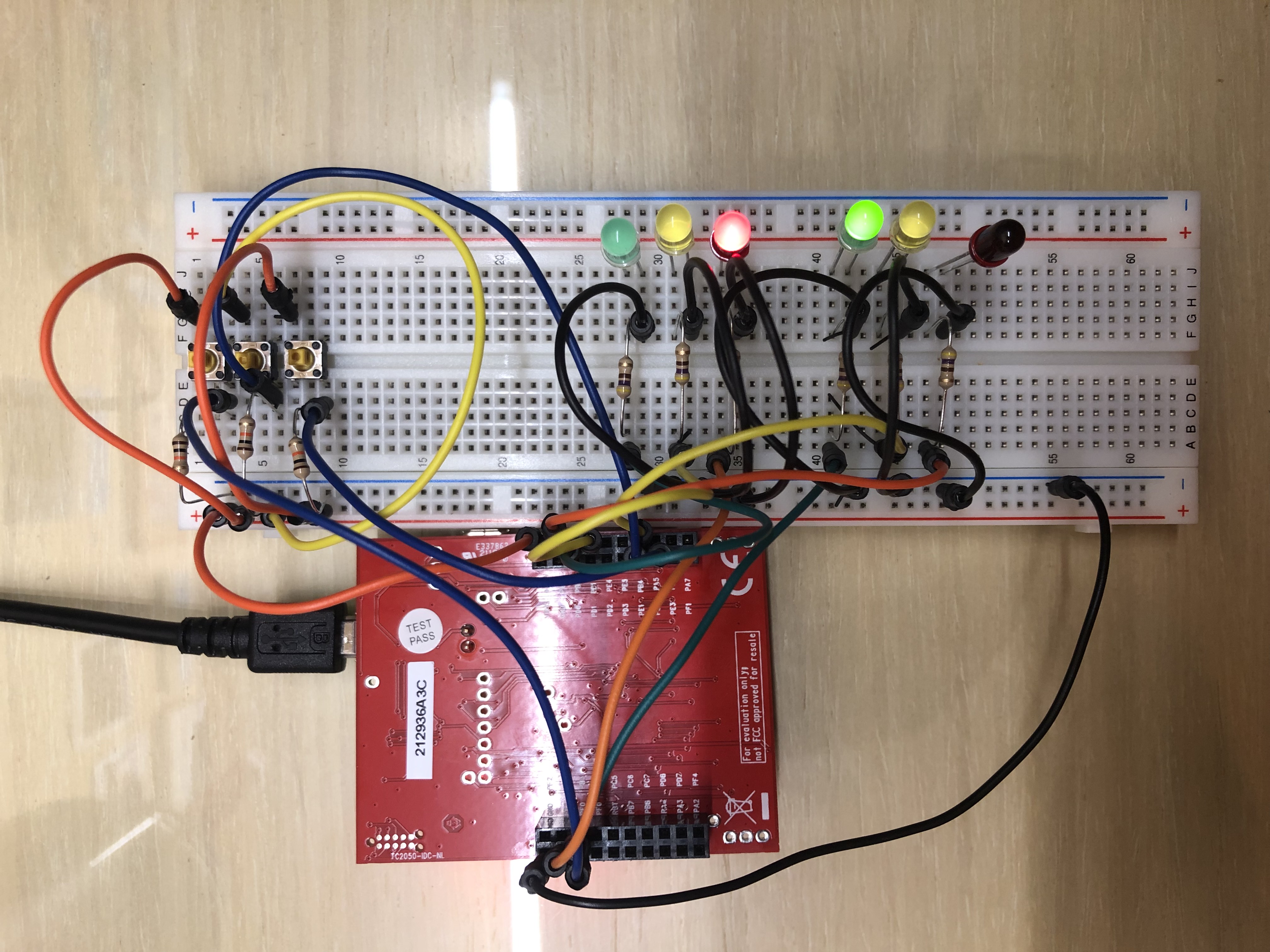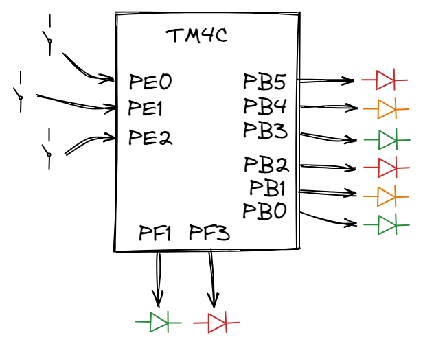 As seen in the diagrams above, there are 3 inputs and 8 outputs. The three switches represent the East-West car sensor, North-South sensor and pedestrian sensor. The 6 LEDs represent the traffic lights for both roads. You might be wondering, where are the LEDs for the pedestrian lights? PF1 and PF3 are connected to a RGB LED on the EK-TM4C123GXL board itself.