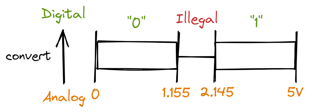 For the EK-TM4C123GXL, an input of 0-1.155V is converted to a digital “0”. An input of 2.145-5V is converted to a digital “1”. Anything between 1.155V and 2.145V is considered illegal. If the microcontroller outputs a sequence of bits, it will produce a waveform: