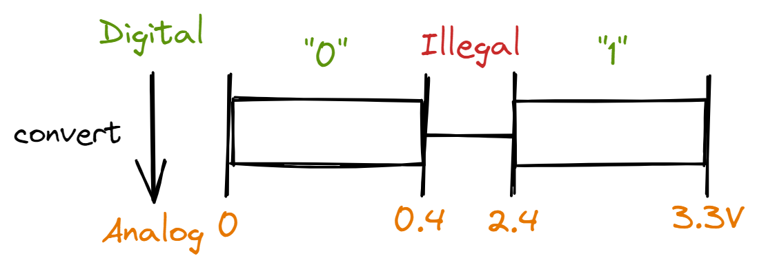 For the EK-TM4C123GXL, a digital “0” is converted to an output of 0-0.4V. A digital “1” is converted to an output of 2.4-3.3V. Anything between 0.4V and 2.4V is considered illegal.