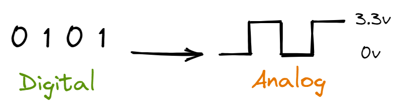 The smallest unit of data a computer can process and store is a bit or binary digit. A bit can only be in one of two states and is often represented as 1 or 0. It can also be represented as on or off, true or false, yes or no. However, in order for the microcontroller to control electronic components in an electrical circuit, it must find some way to convert bits in the software into voltages. This is called Digital to Analog conversion. When the microcontroller outputs a “1”, the output voltage needs to be higher than some threshold. Conversely, when the microcontroller outputs a “0”, the output voltage needs to be lower than some threshold.