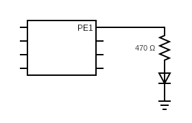 The breadboard and schematic diagrams above illustrate how to connect an LED to the microcontroller. When PE1 outputs 0V (“0”), no current flows through the LED. When PE1 outputs +3.3V (“1”), a current flows through the LED and the LED lights up. We put a 470\(\Omega\) resistor so that the current flowing through the LED is not too large.