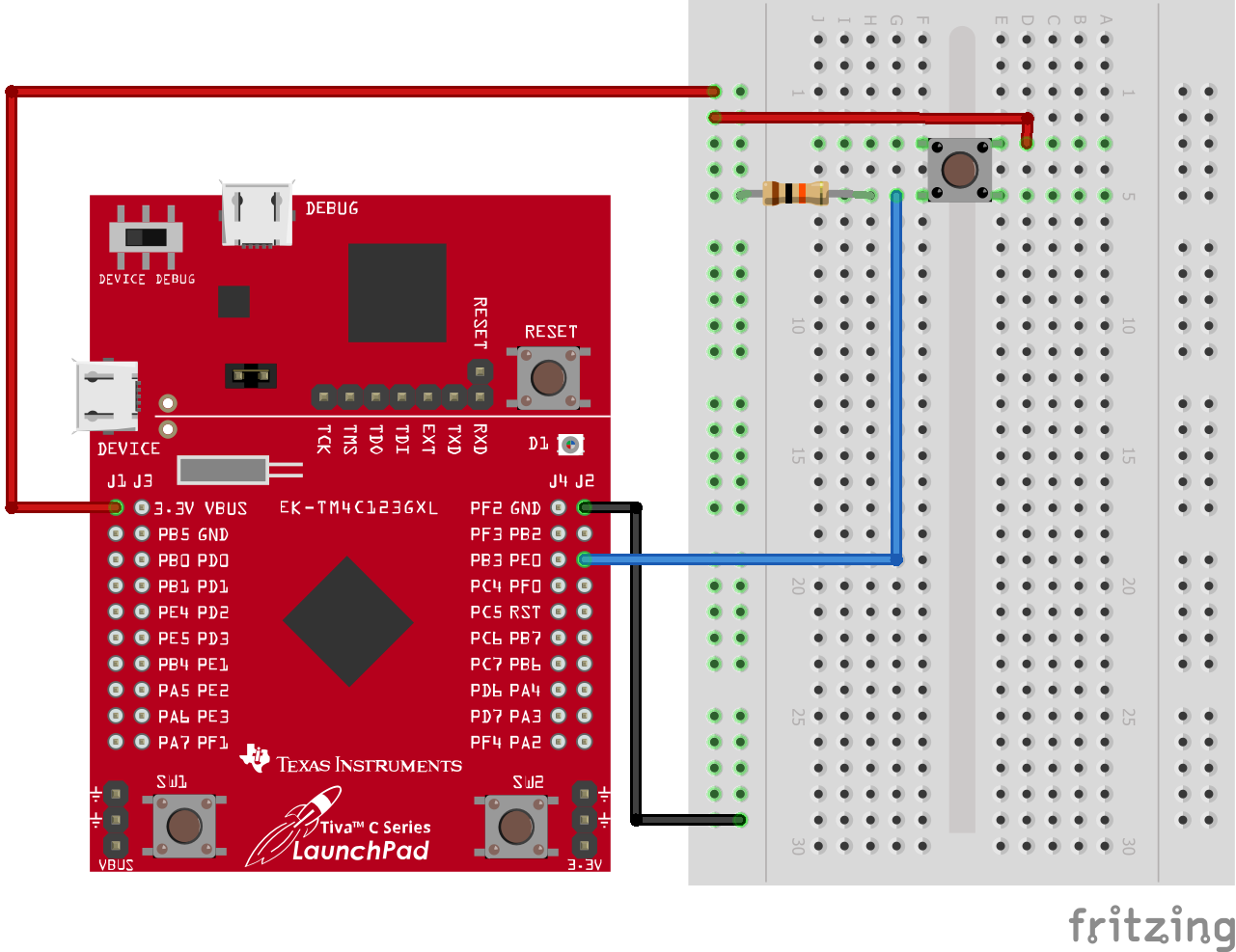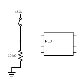 The breadboard and schematic diagrams above illustrate how to connect a switch to the microcontroller. When the switch is open, PE0 is connected to ground (GND) and so the input to PE0 is 0V (“0”). When the switch is closed, PE0 is connected to the +3.3V source and hence the input to PE0 is 3.3V (“1”). A 10k\(\Omega\) resistor is connected to GND so that most of the current will flow between the +3.3V source and PE0.
