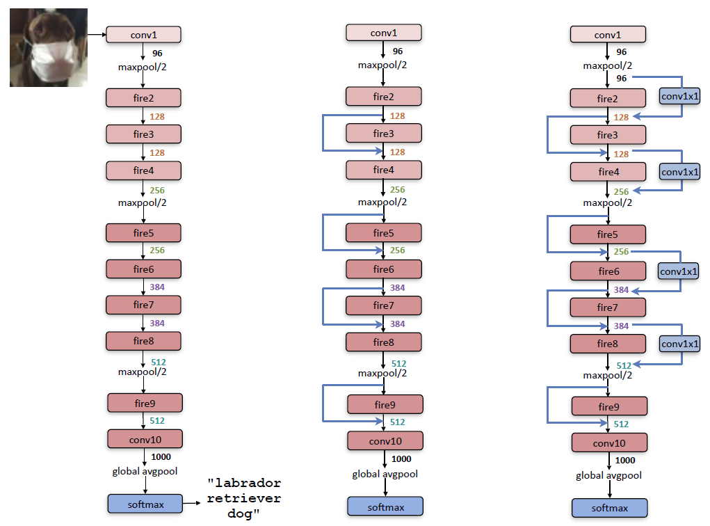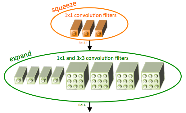 The FireLayers used throughout the network are composed of a “squeeze” layer (1x1 filters) and an “expand” layer that uses 1x1 and 3x3 filters. There are two benefits to this design: firstly, replacing the majority of 3x3 filters with 1x1 filters reduces the number of parameters by ~9 times. Secondly, by reducing the number of filters in the “squeeze” layer, this greatly reduces the number of connections between the “squeeze” layer and the “expand” layer, further reducing the total number of parameters. Check out our implementation of the FireLayer at /fire_mod.py.