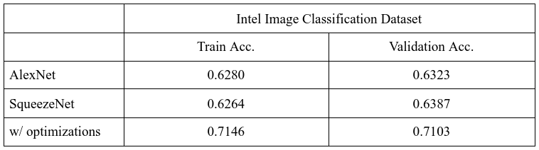 Despite being 300 times smaller than AlexNet, SqueezeNet w/ optimizations had a higher validation accuracy on the Intel Image Classification dataset compared to AlexNet:
