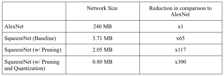 Quantization further reduced SqueezeNet to 0.80 MB, a x300 reduction in comparison to AlexNet’s 240 MB.