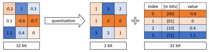 Quantization involves converting the datatype of our weights from floats (32 bits) to ints (8 bits), reducing the number of bits required to represent each number and thus compressing the size of our model by approximately 4x.