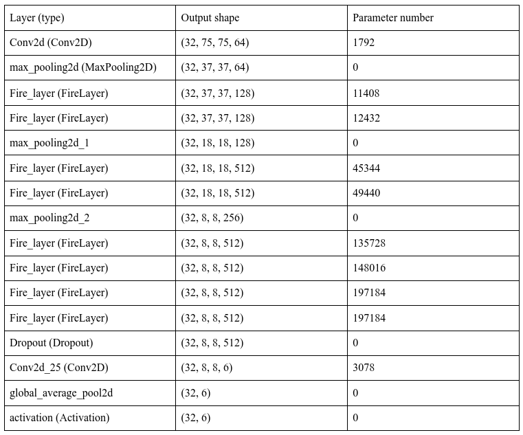 Note that because SqueezeNet was somehow unable to train well on the Intel Image Classification dataset, we opted to use SqueezeNet v1.1 with a slightly different architecture: