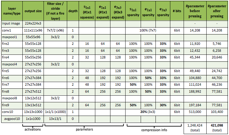 Pruning further reduced SqueezeNet to 2.05 MB, a x117 reduction in comparison to AlexNet’s 240 MB.